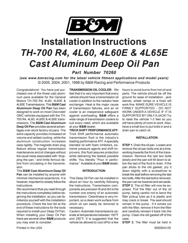 Fits various vehicles with TH700-R4, 4L60, 4L60E & 4L65E Transmissions. Increases Fluid Capacity by 3-quarts.Application Summary: