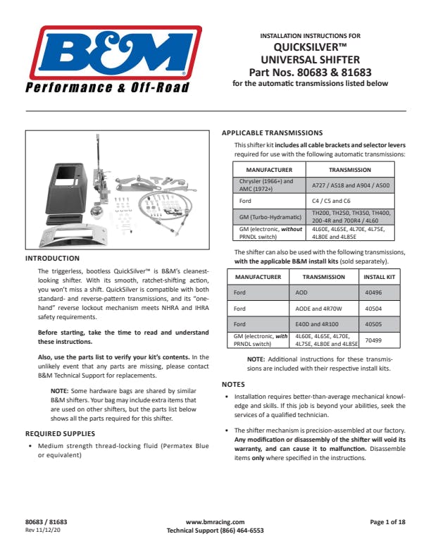 Fits GM TH400, 350, 250, 200, 700R4/4L60, 4L60E, 4L65E, 4L80E automatic transmissions (for 4L60E, 4L65E, 4L80E with PRNDL switch, use optional bracket kit #70499. Ford C4, C5, C6 and AOD (AOD will require optional kit#40496) AODE, 4R70W #40504 and E40D & 4R100 will require optional kit #40505. Fits Chrysler 1966 and later Torqueflite A727 (36RH/37RH), A518 (46RH/46RE), A618 (47RH/47RE/48RE), A904 (30RH), A999 (32RH), A500 (40RH/42RH/40RE/42RE/44RE) automatic transmissions. Overall Dimensions - 12.25 x 6.21 x 12.25| Attributes | |