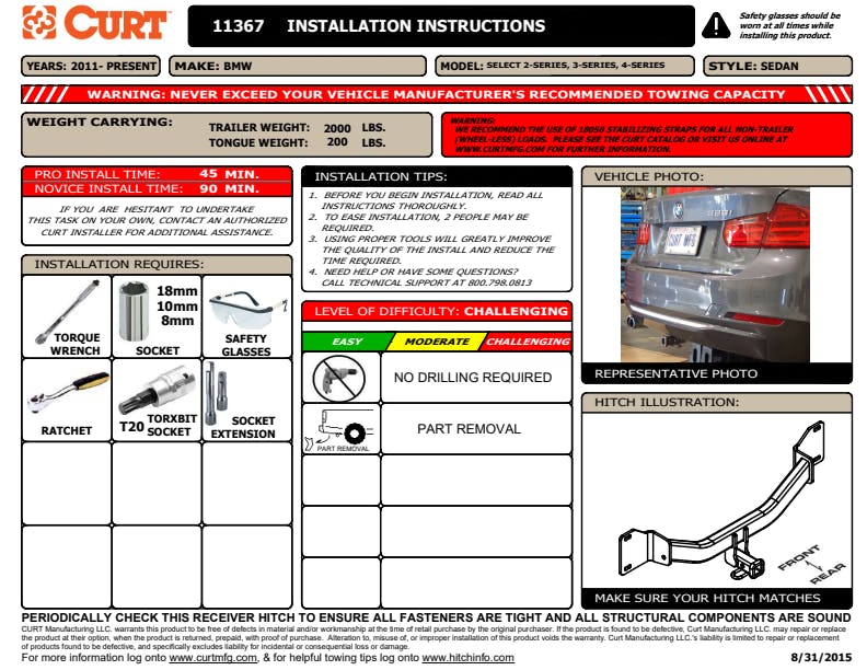 However you define adventure -- whether it's climbing onto the back of a mountain bike, hunting from the top of a tree stand or camping with the family a long way from nowhere -- CURT class 1 hitches provide a light-duty towing receiver to help you Bring It. Each is made to fit a specific vehicle, providing easier installation, a better fit and optimal towing capacity. Custom class 1 trailer hitches are available for a variety of smaller vehicle types, including the compact car, crossover, minivan and small SUV. This particular class 1 hitch is designed to be a custom hitch for certain years of the BMW 228i, 320i, 325i, 328d, 328i, 335i xDrive, 340i, 428i and 435i (to verify vehicle compatibility, see the CURT application guide at curtmfg.com). Tested in accordance with SAE J684, it offers a weight carrying capacity of 2,000 lbs. GTW and 200 lbs. TW. It is equipped with 1-1/4" receiver tube opening to accept a ball mount shank or other hitch mount. This class 1 hitch also comes with all necessary mounting hardware. With its lightweight design and smaller receiver tube size, a class 1 hitch is especially useful for adding cargo space with a hitch-mounted bike rack or cargo carrier. They can also typically be used to tow small trailers such as a utility trailer, kayak trailer or teardrop camper (never exceed the lowest weight capacity of any towing component; i.e. the vehicle, hitch, trailer, etc). Though CURT class 1 trailer hitches are only intended for light-duty towing, we apply the same principles of quality as we do to the rest of our rear mount hitches. Each class 1 hitch is made with hands-on engineering, high-strength steel and precise welding. We use a co-cured finish of liquid A-coat, inside and out, and durable black powder coat to provide a lasting defense against rust, chips and UV rays.