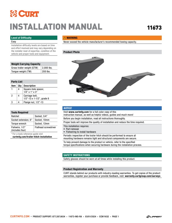 However you define adventure -- whether it's climbing onto the back of a mountain bike, hunting from the top of a tree stand or camping with the family a long way from nowhere -- CURT class 1 hitches provide a light-duty towing receiver to help you Bring It. Each is made to fit a specific vehicle, providing easier installation, a better fit and optimal towing capacity. Custom class 1 trailer hitches are available for a variety of smaller vehicle types, including the compact car, crossover, minivan and small SUV. This particular class 1 hitch is designed to be a custom hitch for certain years of the Hyundai Sonata (to verify vehicle compatibility, see the CURT application guide at curtmfg.com). Tested in accordance with SAE J684, it offers a weight carrying capacity of 2,000 lbs. GTW and 200 lbs. TW. It is equipped with 1-1/4" receiver tube opening to accept a ball mount shank or other hitch mount. This class 1 hitch also comes with all necessary mounting hardware. With its lightweight design and smaller receiver tube size, a class 1 hitch is especially useful for adding cargo space with a hitch-mounted bike rack or cargo carrier. They can also typically be used to tow small trailers such as a utility trailer, kayak trailer or teardrop camper (never exceed the lowest weight capacity of any towing component; i.e. the vehicle, hitch, trailer, etc). Though CURT class 1 trailer hitches are only intended for light-duty towing, we apply the same principles of quality as we do to the rest of our rear mount hitches. Each class 1 hitch is made with hands-on engineering, high-strength steel and precise welding. We use a co-cured finish of liquid A-coat, inside and out, and durable black powder coat to provide a lasting defense against rust, chips and UV rays.