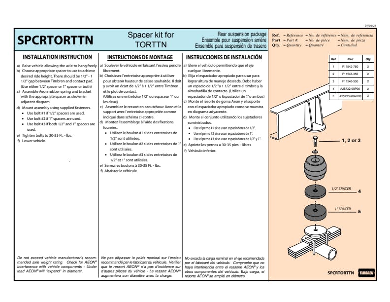 Popular Timbren SES kits were designed to work on pickup trucks with a standard ride height. But installing a lift kit on your pickup truck will increase the distance between the frame and the rear leaf spring and, therefore, compromise the effectiveness of the Timbren SES helper springs. In other words, your lifted truck is still going to squat even after a Timbren SES rear kit has been installed. That's where an approved Timbren spacer kit can fill the gap. This spacer kit will enable you to haul your gear with confidence even if your lifted Toyota Tacoma or Toyota Tundra has approximately 6.00" - 7.50" of space between the frame and the rear leaf spring. Here's how it works: Each spacer kit comes with two 1 inch and two 1/2 inch spacers along with all the necessary hardware. This handy little kit helps you mix and match the spacers when you add them to the Timbren SES assembly allowing you to achieve your desired ride height. Whether you've got a leveling kit, body lift or full suspension lift, Timbren spacer kits allow you to make effective use of your Timbren SES kit while hauling or towing your gear. How Do I Know If I Need a Spacer Kit? To determine whether you need a spacer kit, measure between the frame and rear leaf spring of the truck when empty. If the gap between frame and axle for your Toyota Tacoma or Toyota Tundra is approximately 6.00" - 7.50" you will need to order a spacer kit.